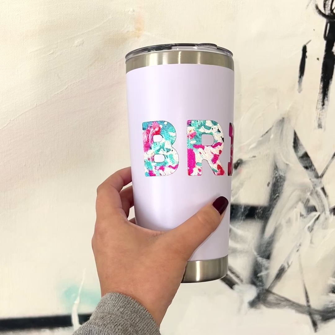 El termo incluye 5 letras de colores "BRIDE" como aparece en la foto. Puedes agregar más iniciales con costo.